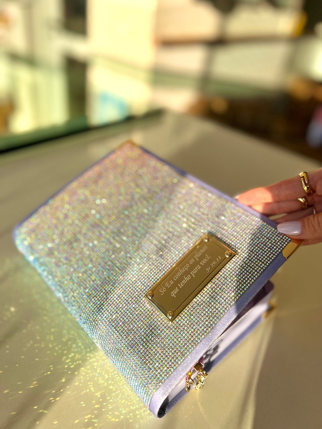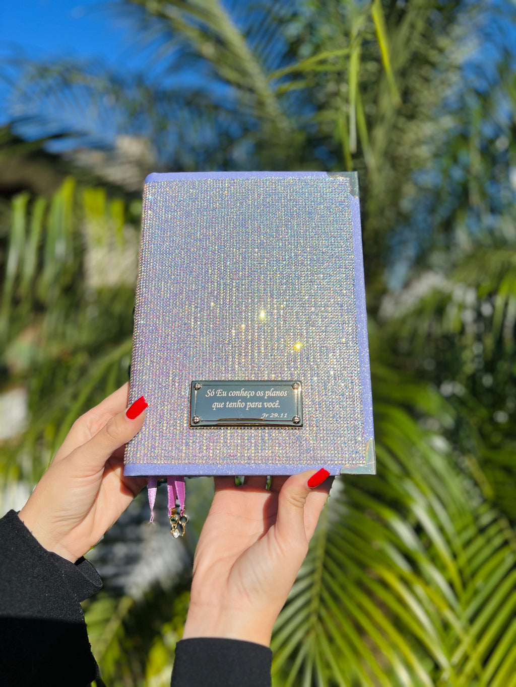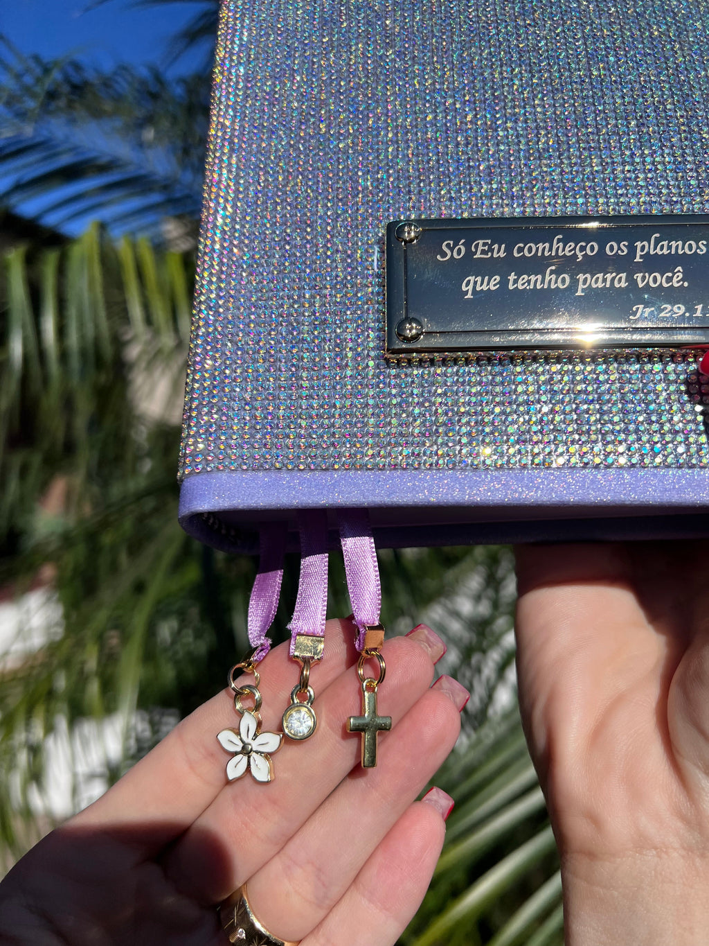 Feito em glitter coberto por pedrarias essa bíblia é digna de um reinado e sim você filha do Rei com cantoneiras banhadas à ouro, acompanha 3 pingentes marcadores de página e placa grande dourada. (Escreva seu nome ou versículo).