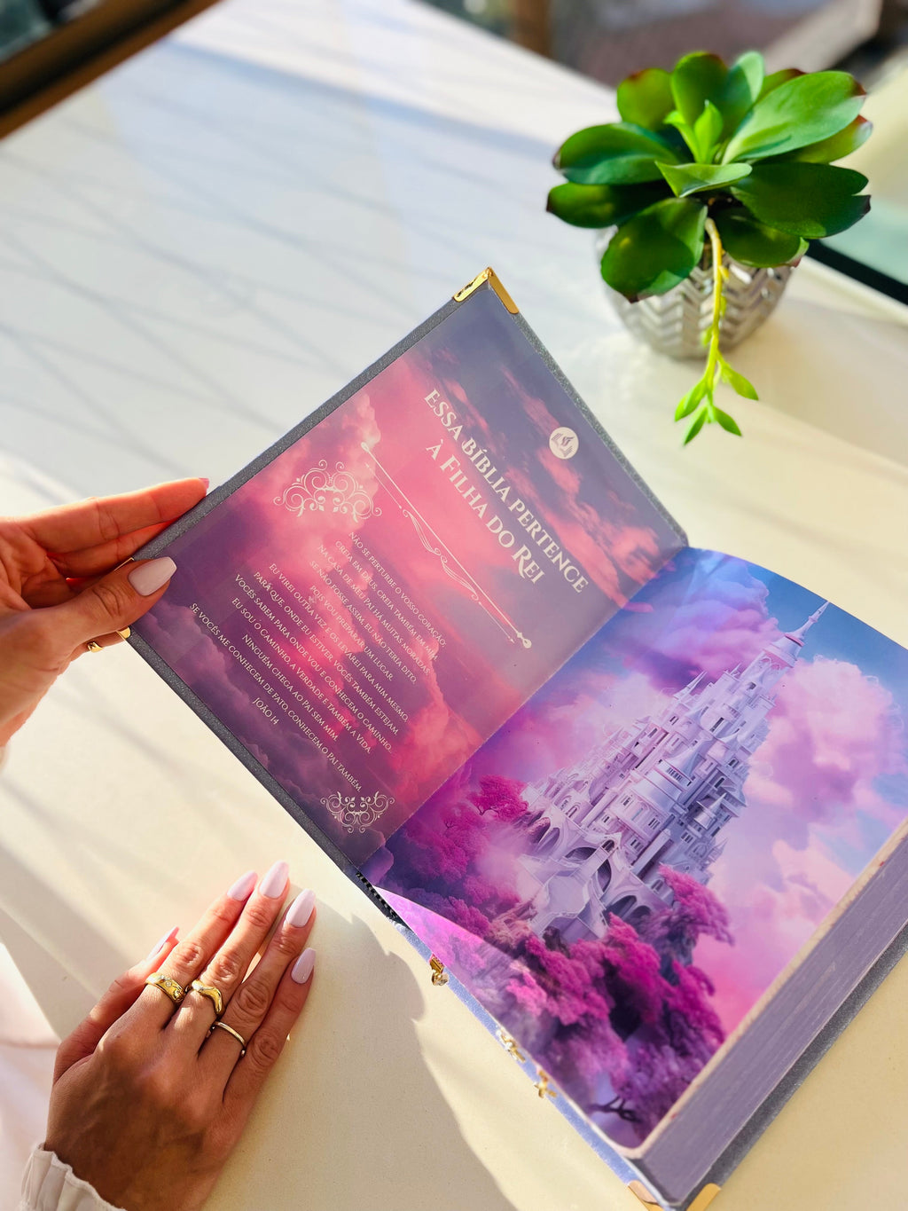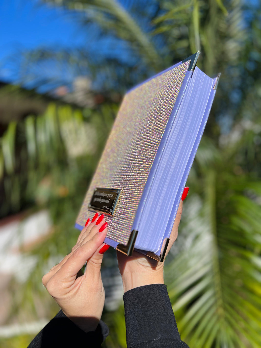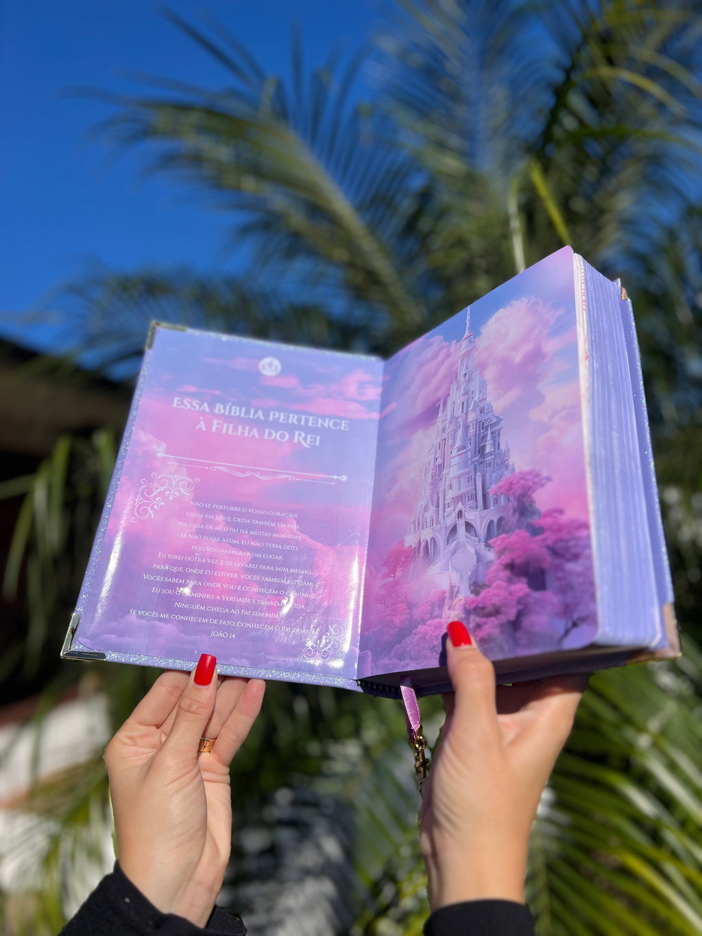 Feito em glitter coberto por pedrarias essa bíblia é digna de um reinado e sim você filha do Rei com cantoneiras banhadas à ouro, acompanha 3 pingentes marcadores de página e placa grande dourada. (Escreva seu nome ou versículo).