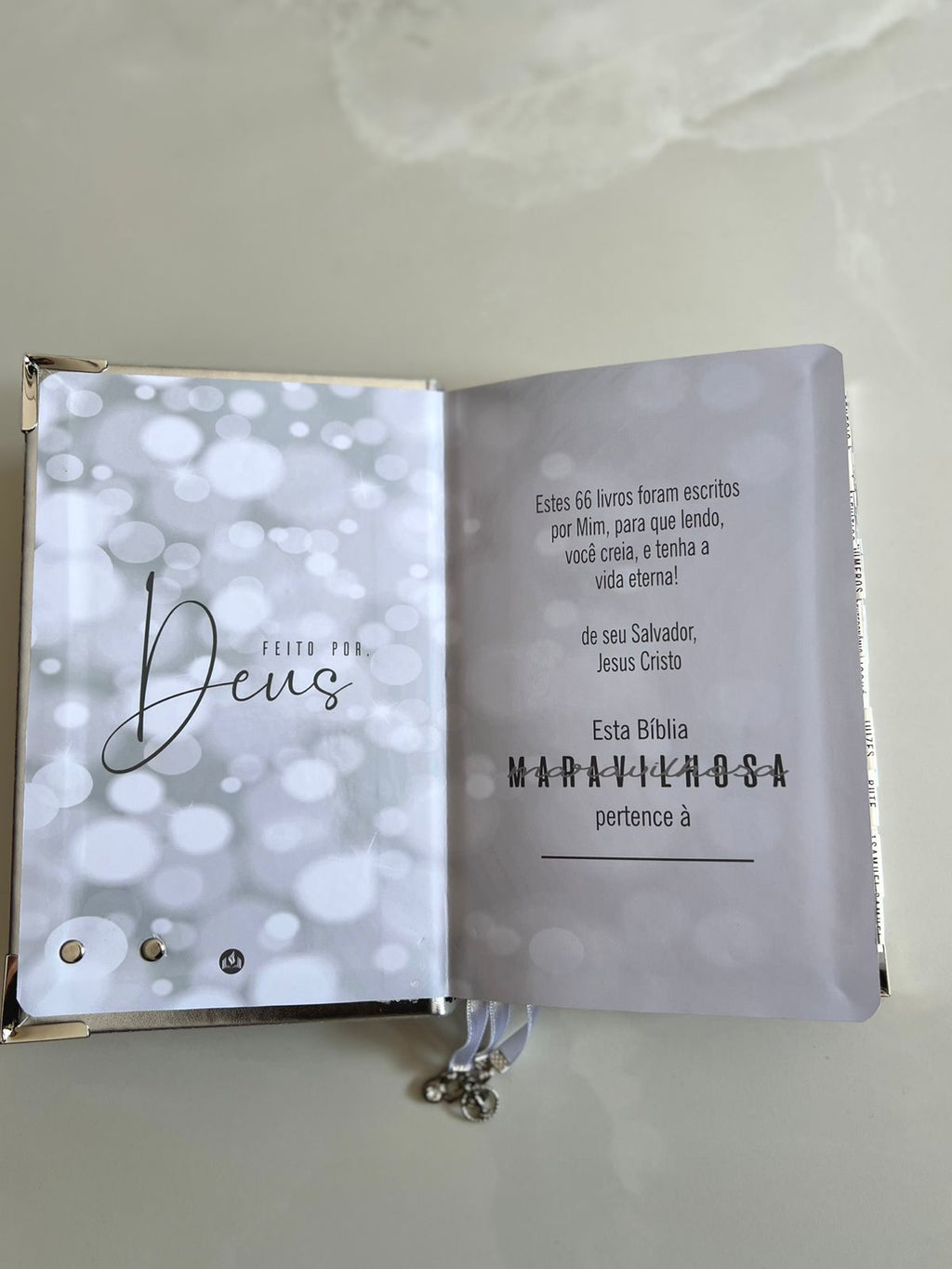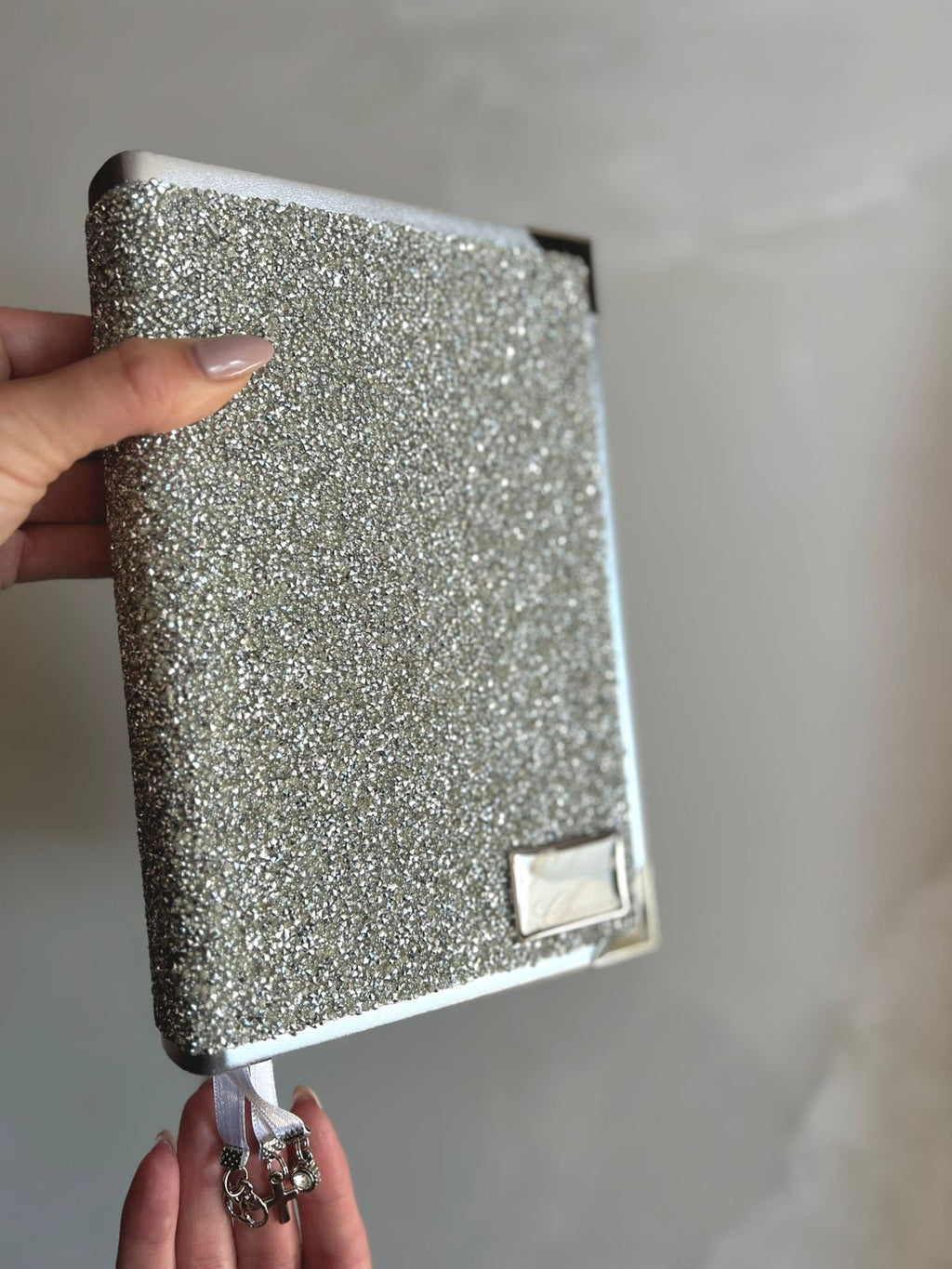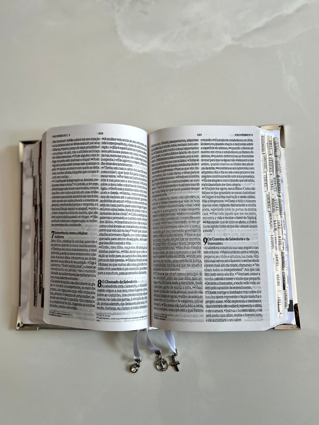 Feito em tecido de pedrarias  com cantoneiras prata acompanha 3 pingentes marcadores de página e placa pequena. (Escreva seu nome ou versículo).
