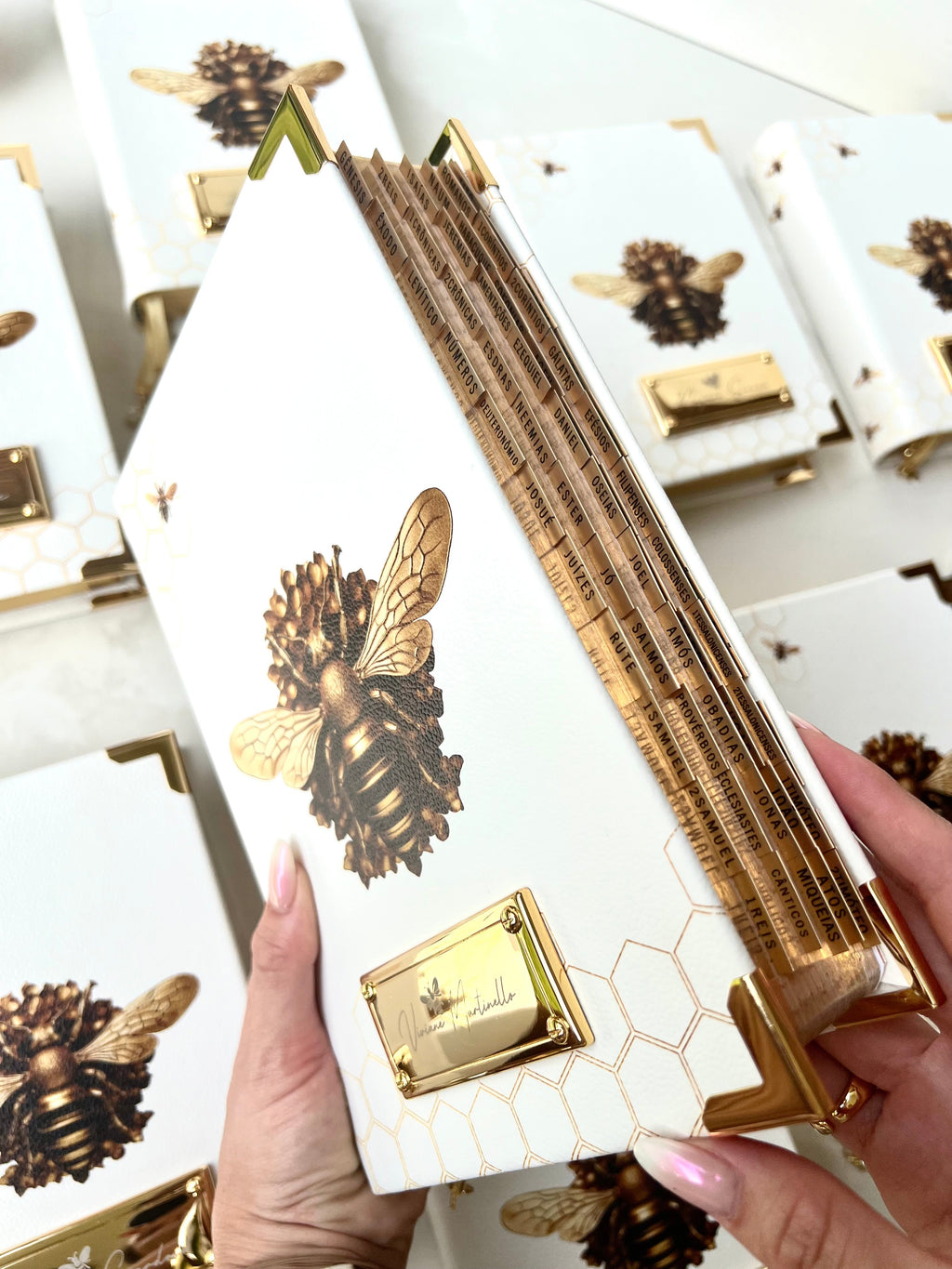 Bíblia personalizada com courino "couro fake" estampado com Abelha, finalizado com cantoneiras banhadas a ouro, fitinha de cetim e 2 pingentes.