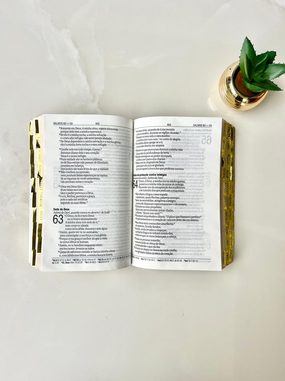 Bíblia + Cartela de índice aplicada Dourada + 2 pingentes marcadores de página combinando sendo cruz e abelha + Placa Metalizada Grande (Personalize com o seu nome.)