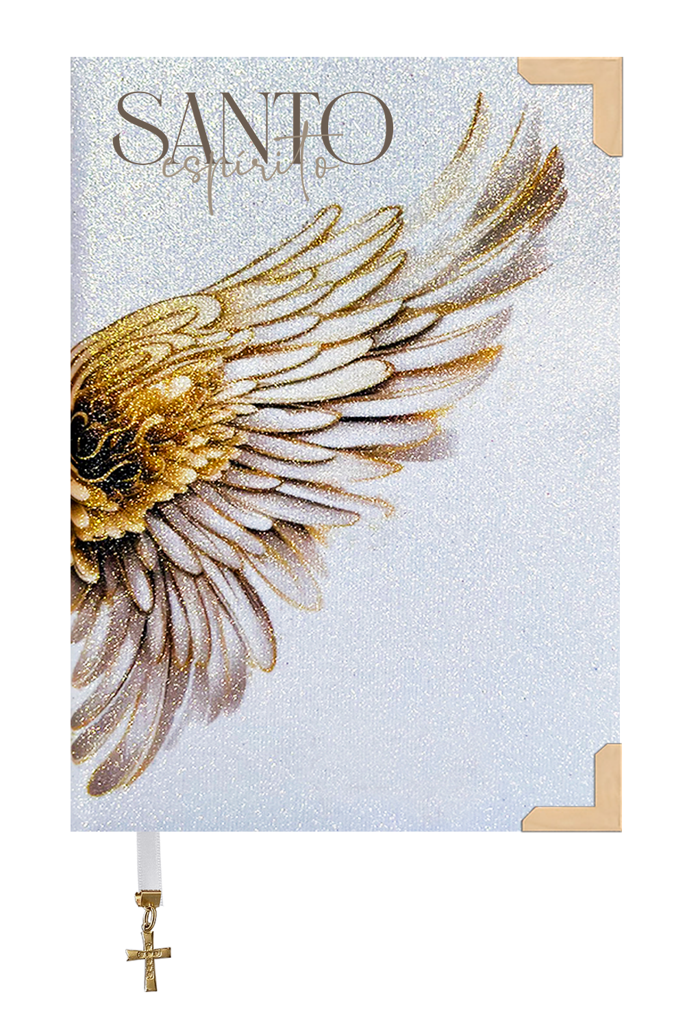 Bíblia personalizada com tecido texturizado em glitter branco com asas do Espírito Santo em dourado.