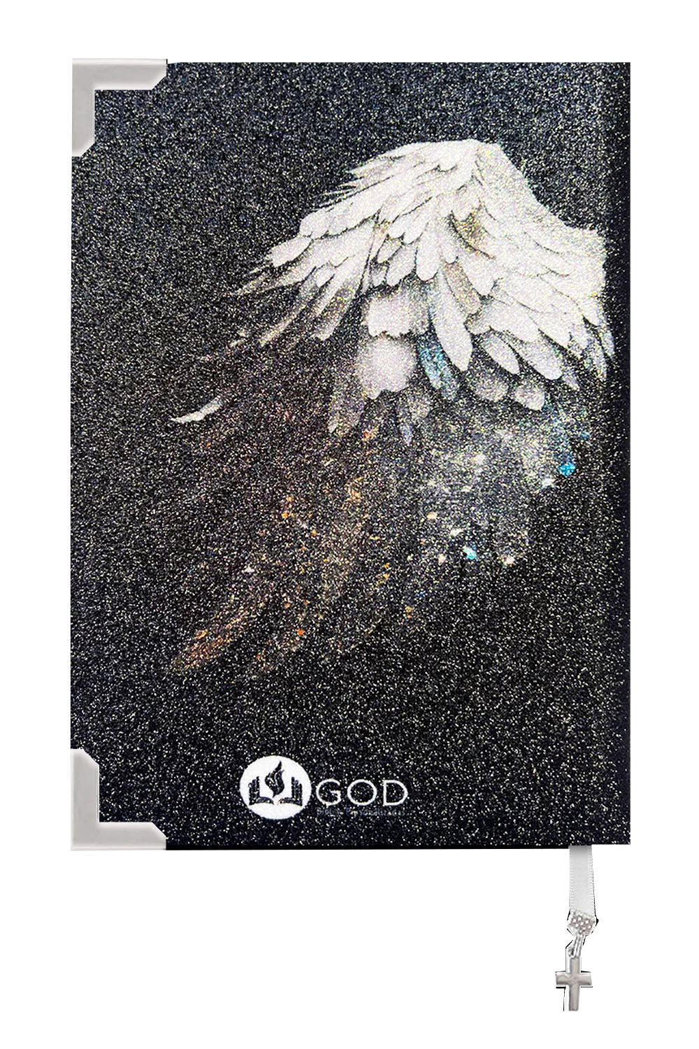 Bíblia personalizada com tecido texturizado em glitter preto com asas do Espírito Santo em preto e branco.