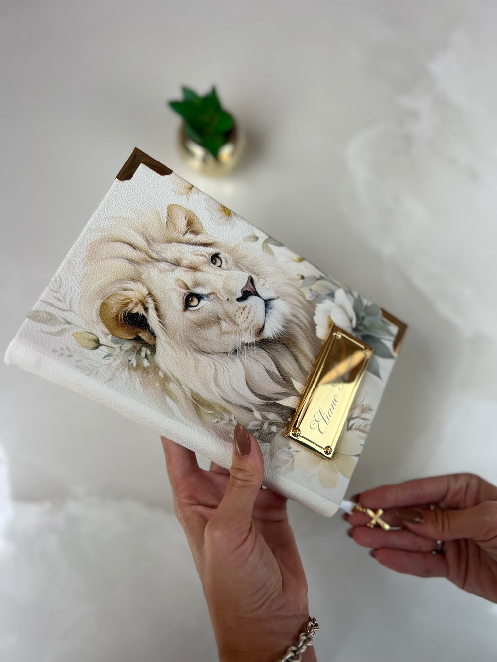 Bíblia personalizada com courino branco com Leão, finalizado com cantoneiras banhadas a ouro, fitinha de cetim e pingente de cruz combinando com a bíblia! Acompanha a PLACA grande e cartela de índice dourada. Coloque seu nome ou versículo bíblico.