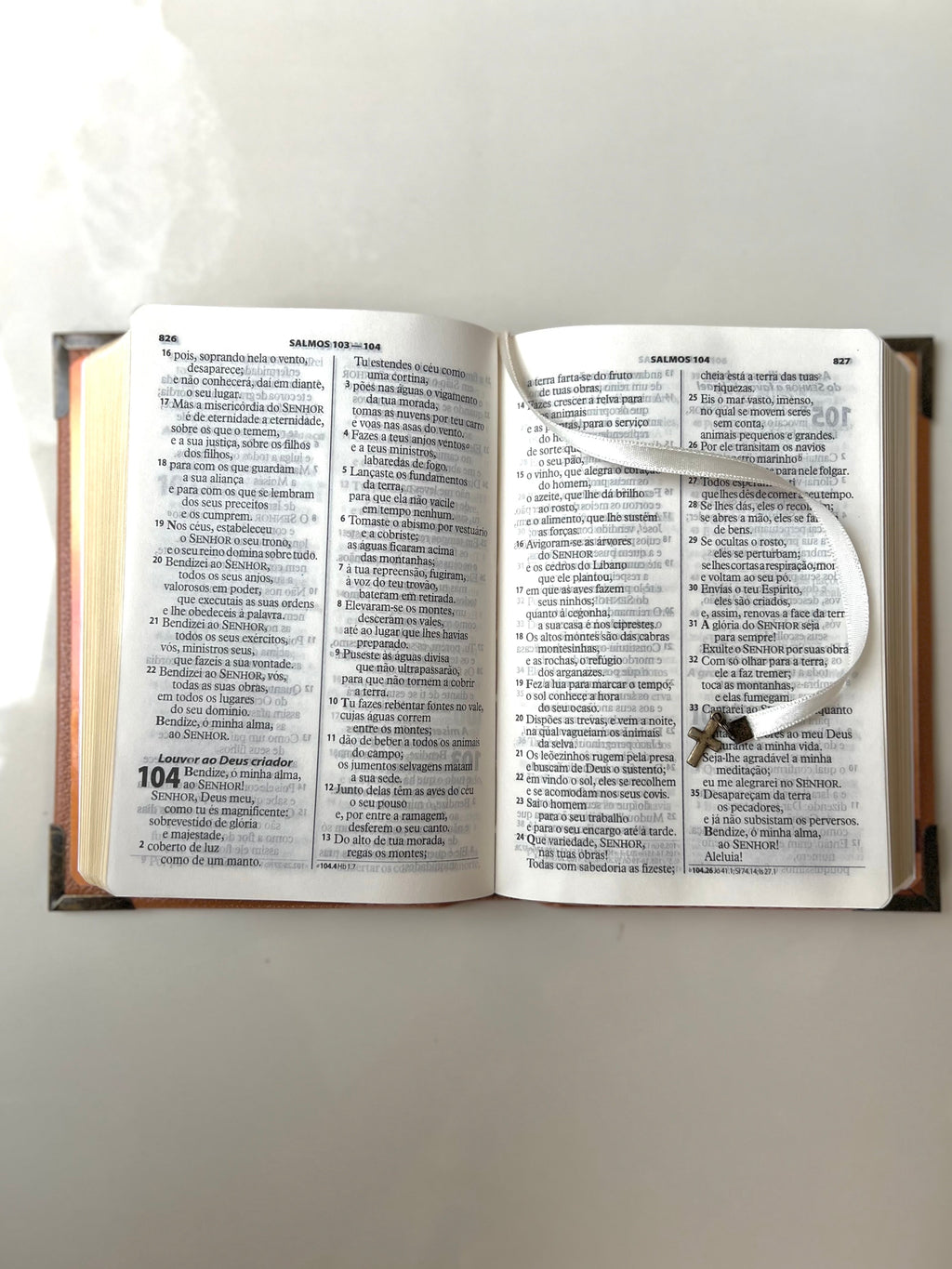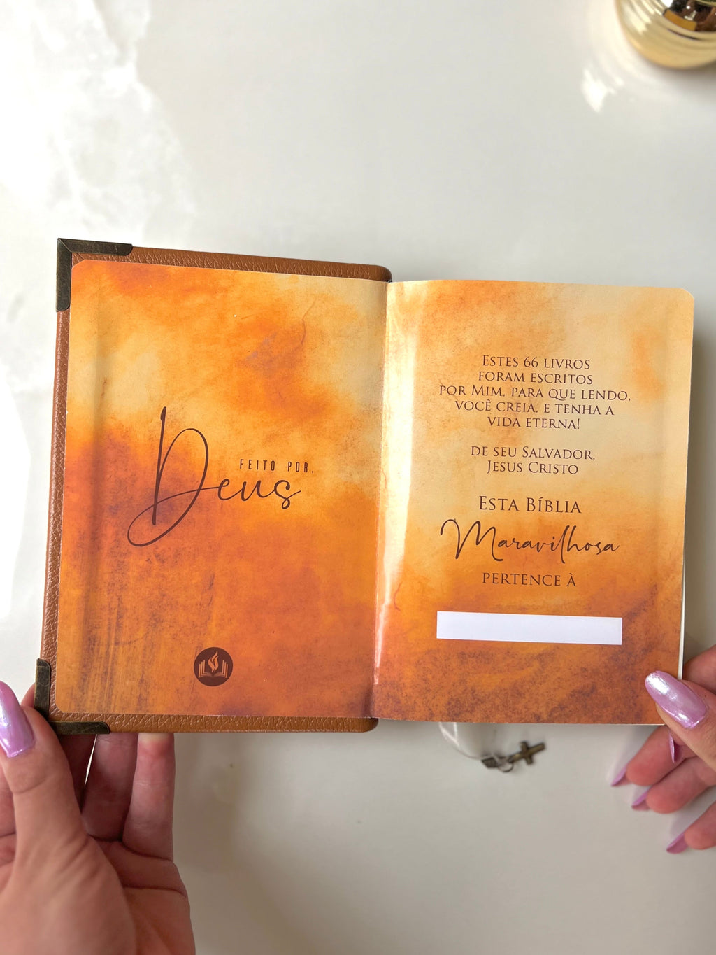 Material em Couro legítimo na cor Caramelo com estampa Leão, cantoneiras envelhecidas e pingente de cruz combinando com a bíblia.