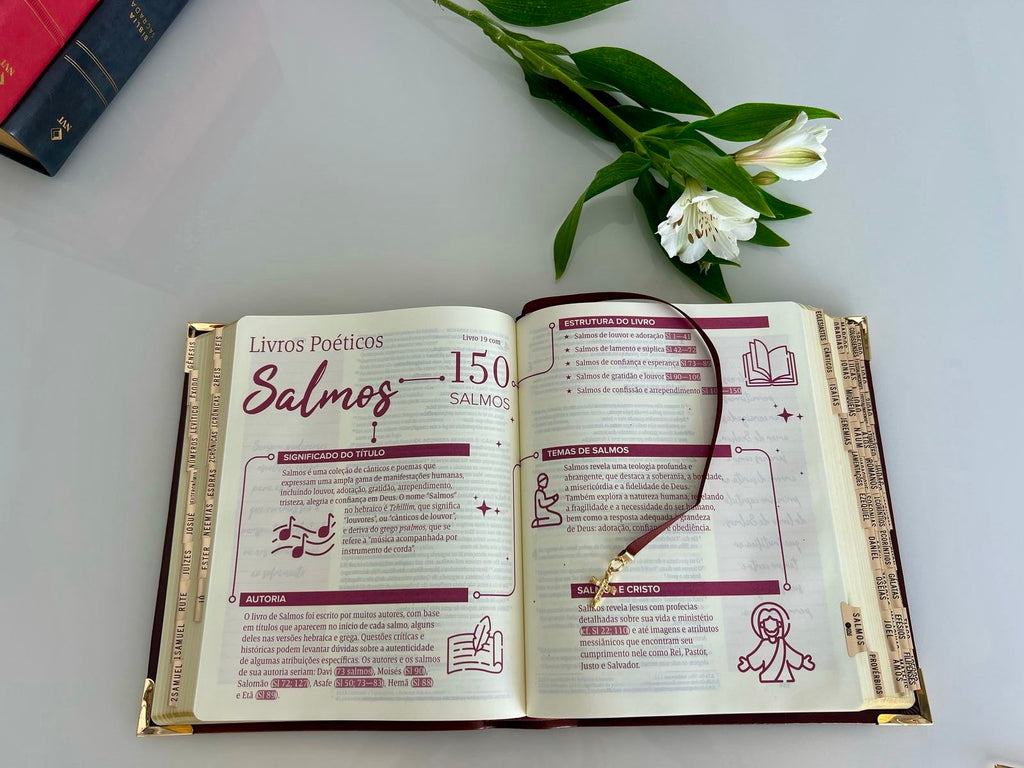 A Bíblia Mulheres NVT é mais do que uma Bíblia, é uma companheira de jornada. Elaborada com carinho pela pastora Viviane Martinello, essa edição foi pensada para fortalecer sua caminhada com Deus, oferecendo recursos que tornam o estudo bíblico mais profundo, pessoal e envolvente. Está incluso a placa pequena prata, cartela de índices prata cantoneiras e pingente.