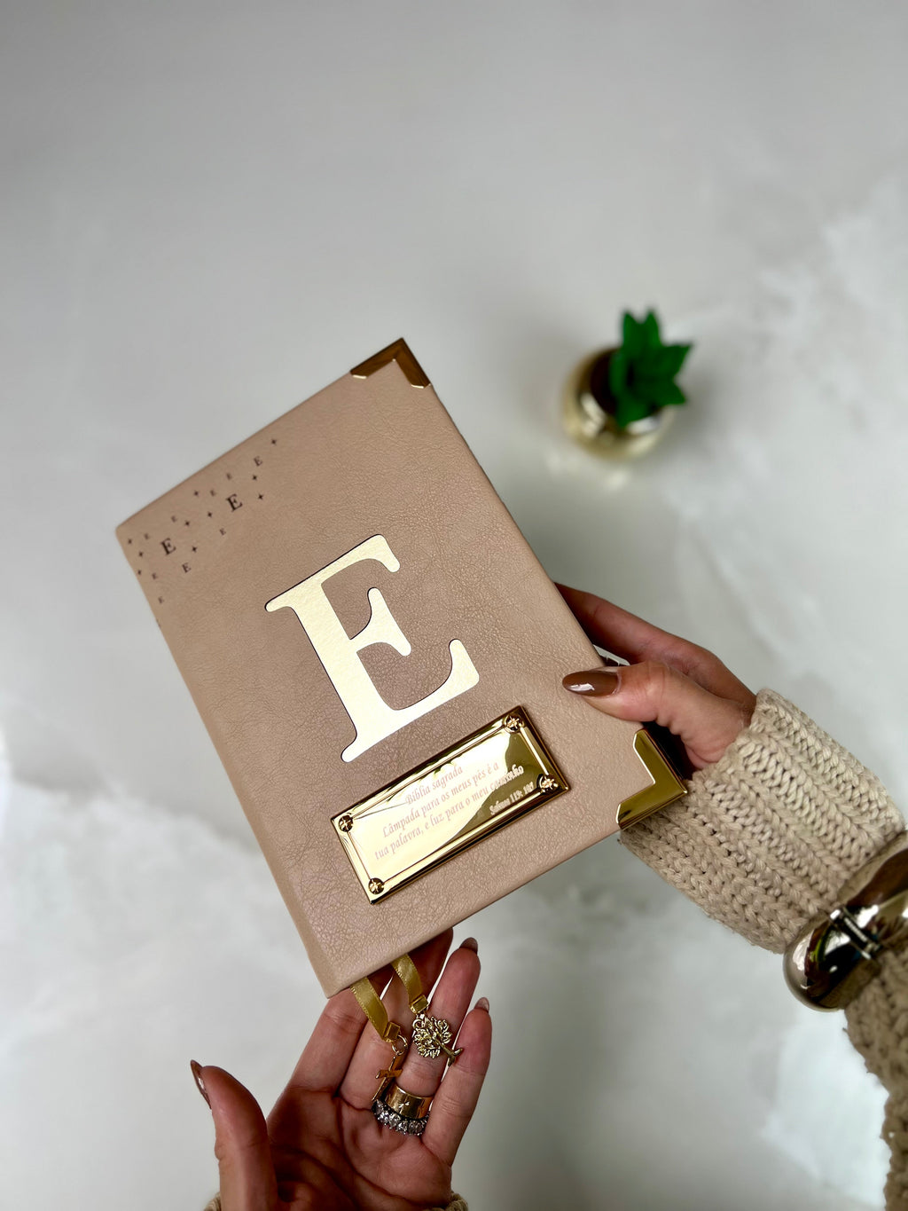 Combo Bíblia personalizada com courino nude com vazado da sua inicial, finalizado com cantoneiras banhadas em verniz italiano dourado, fitinha de cetim e pingente de cruz combinando com a bíblia! Acompanha Placa Grande, Cartela de índice Dourada e pingente com cruz dourado.