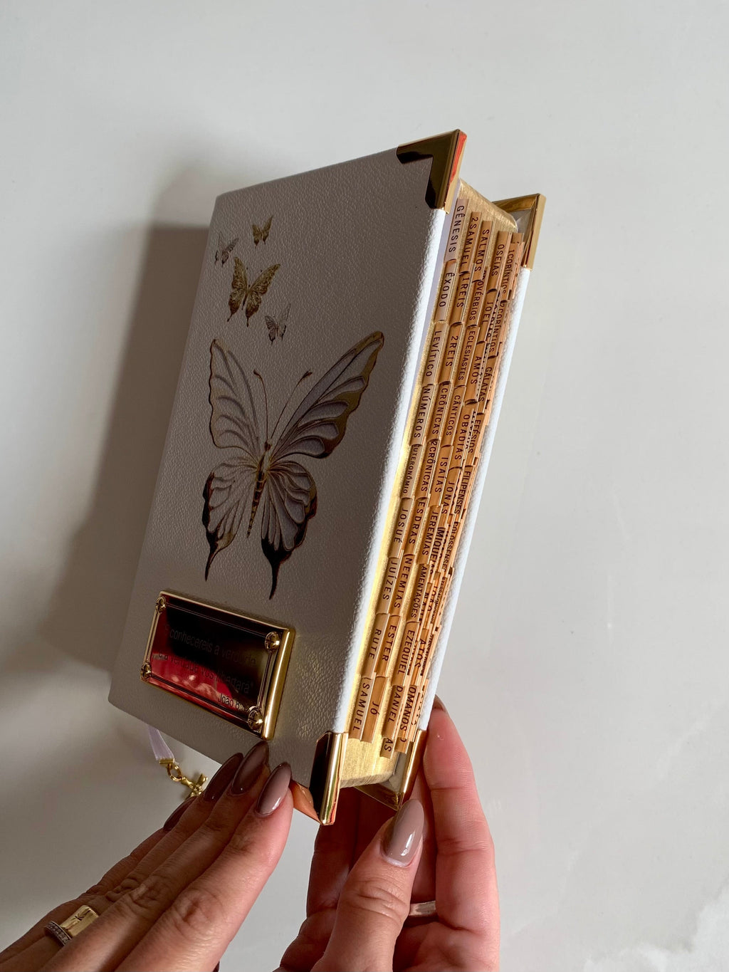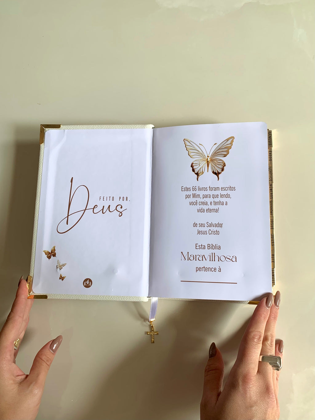 Combo Bíblia personalizada com courino branco estampado com Borboletas, finalizado com cantoneiras banhadas a ouro, fitinha de cetim e pingente de cruz combinando com a bíblia! Acompanha Placa Grande, Cartela de índice e pingente de cruz.