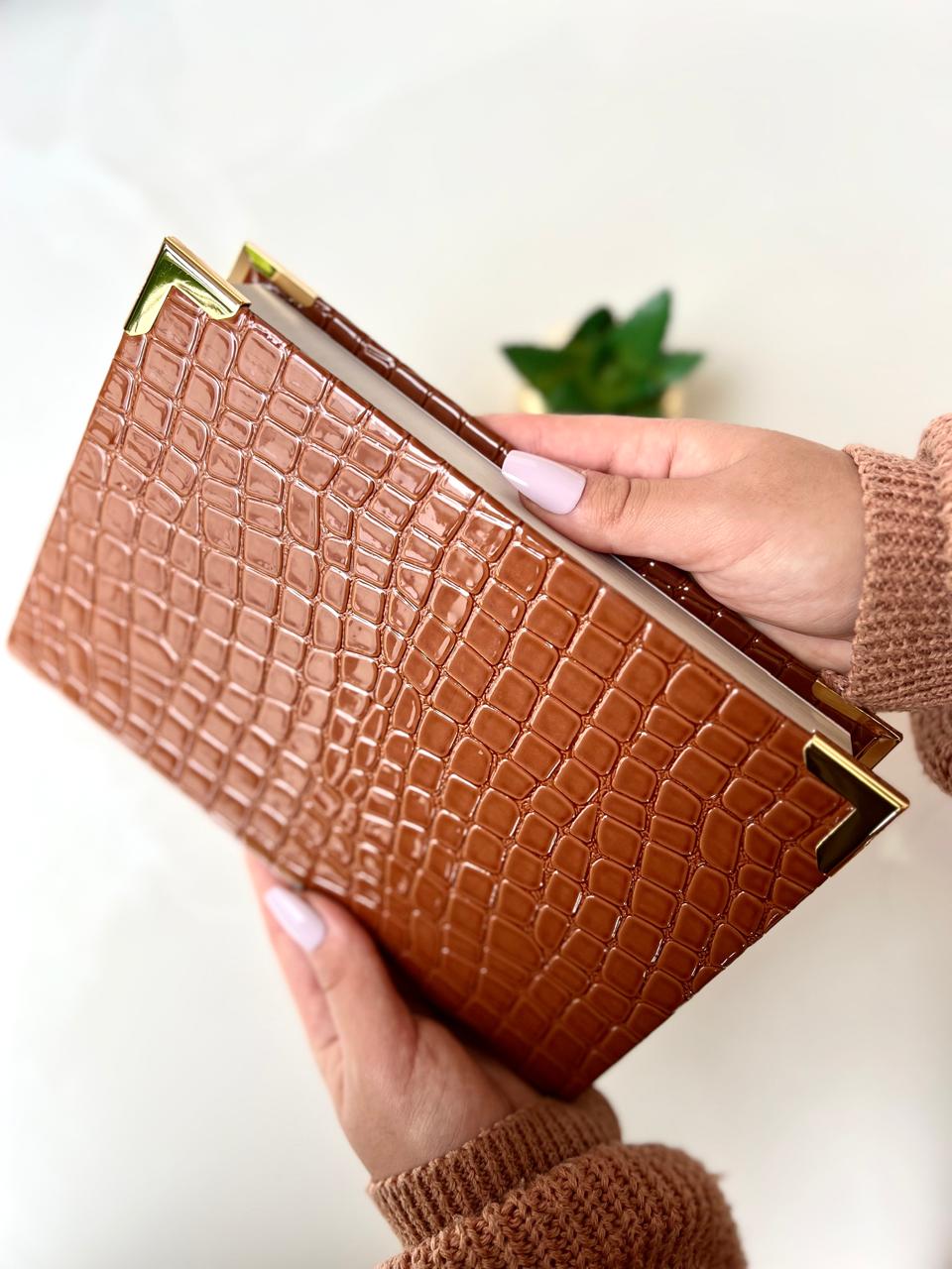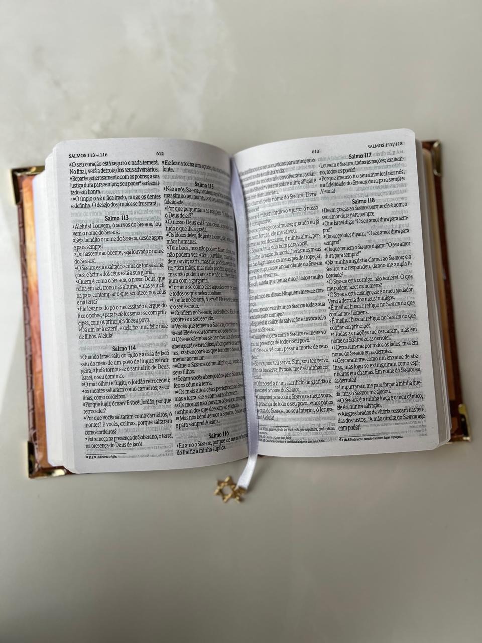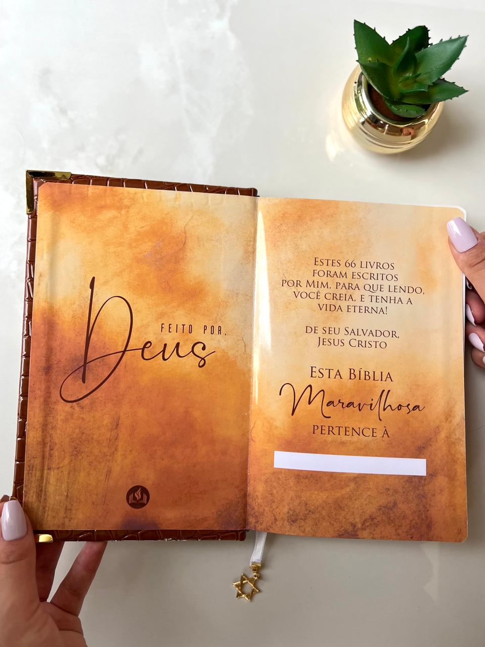 Bíblia Courino Croco Quadrado, finalizado com cantoneiras banhadas douradas eFita de cetim com pingente Estrela de Davi