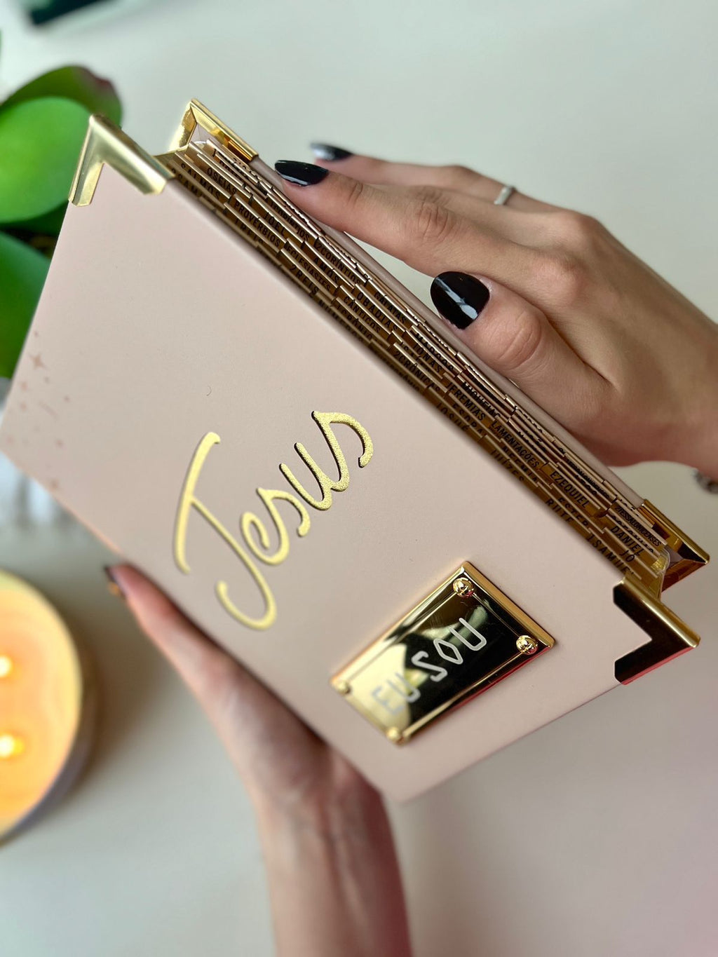 Combo Bíblia personalizada em courino nude vintage com Jesus vazado e iniciais gravado, finalizado com cantoneiras douradas, fitinha de cetim e pingente de Cruz combinando com a bíblia! Acompanha Placa Grande, Cartela de índice dourada e pingente da Cruz.