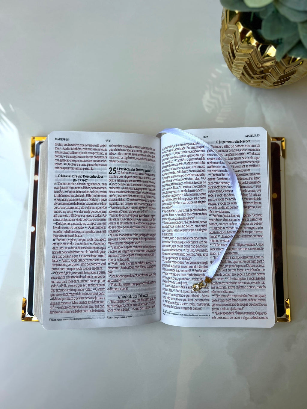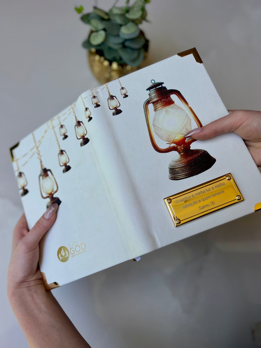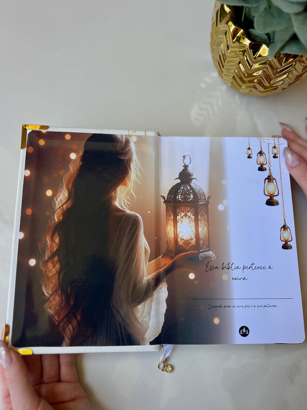 Bíblia personalizada com courino "couro fake" estampado com Lamparina, finalizado com cantoneiras banhadas a ouro. Criação inspirada no livro Mateus a parábola que Jesus ministrou das 10 Virgens. Nossa oração é que vc tenha sede e fome da palavra de Deus e que Ele derrame óleo fresco sobre a sua vida.